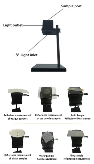Интегрирующая сфера имеет 3 отверстия, одно из которых является входом для света, подключенным к источнику света, а перед входом для света установлено коллимирующее зеркало, падающее под углом 8° к нормали. Один из них заключается в том, что выходной порт перпендикулярен нормали и используется для подключения спектрометра. Все входные и выходные порты являются общими оптоволоконными интерфейсами SMA905. Существует также порт для отбора проб, чтобы предотвратить тестирование образцов.