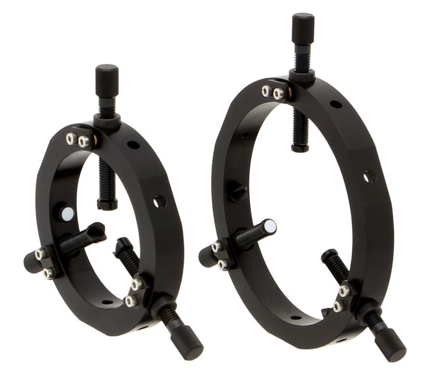 Универсальные держатели 4LM149-10 и 4LM149-05 используются с любыми круглыми объектами, такими как линзы, зеркала и лазеры, любой толщины. Три опоры оправы оснащены универсальными алюминиевыми невращающимися V-образными сменными наконечниками для зеркальных объективов и др. Неабразивные плоские алюминиевые наконечники с тефлоновым покрытием для лазеров можно хранить в специальных отверстиях в несущем алюминиевом кольце, если они не используются.