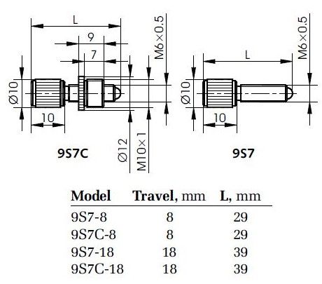 Регулировочный винт 9S7 имеет миниатюрный размер и чувствительность в 1.5 мкм. 9S7C состоит из винта с резьбой M6x0.5 и втулки с резьбой M10x1 ( возможен вариант с резьбой М10x0.5).