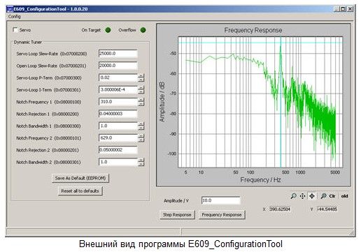 Подстройка параметров контроллера может потребоваться, например, после изменения нагрузки или профиля движения платформы. При помощи ПО E609_ConfigurationTool могут быть заданы такие параметры как коэффициент передачи обратной связи, временная постоянная интегрирования, время нарастания сигнала, частота режекторного фильтра и др.