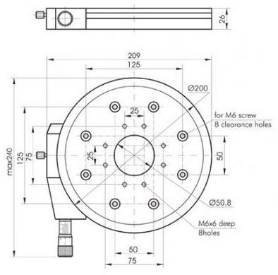 Используется для ручного вращения оптических элементов непрерывно на 360° с точностью 1° с последующей точной настройкой при помощи микровинта в пределах 10° с точностью 0,5’. Столик имеет отверстие с чистой апертурой 50 мм. Платформа имеет набор крепёжных отверстий М6.