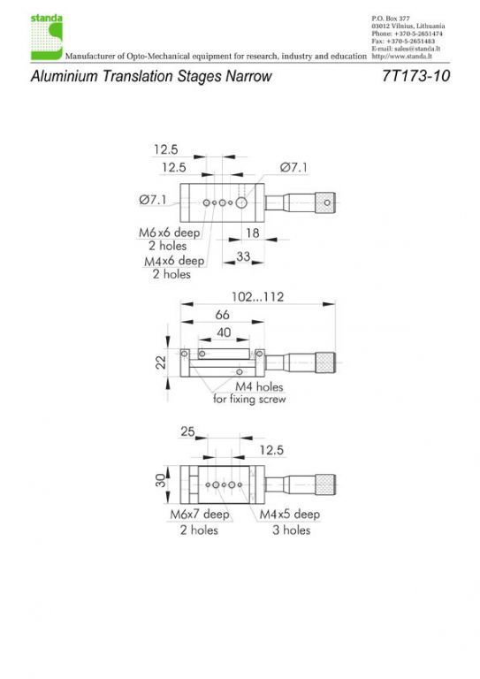 Линейные трансляторы 7Т173 обеспечивают линейное перемещение с ручной регулировкой. В качестве ведущего винта, используются стандартные микровинты 9S75M. Возможен заказ с другими винтами, например, с несоответвствующим значением перемещения, для уменьшить габариты. Платформа подпружинена по отношению к ведущему винту для обеспечения высокого разрешения, малого люфта, плавного и точного движения. Несколько крепёжных отверстий на основании и подвижной платформе обеспечивают различные способы монтажа, в том числе с помощью стержней 3MP.