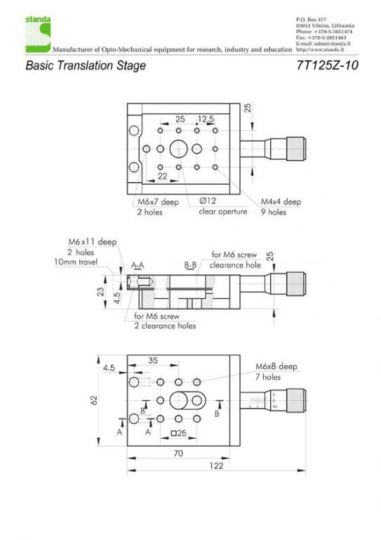 Для крепления транслятора по оси Z используются два винта М6. 7Т125Z-10 имеет отверстие М6 на платформе и М4 — на базе. База имеет чистую апертуру диаметром 12 мм, которая не перекрывается по длине всего перемещения. Платформа перемещается по шарикоподшипниковым направляющим и подпружинена. Нагрузка до 3 кг при вертикальной установке. Трансляторы крепятся напрямую к трансляторам своего или другого типа, а также к оптическому столу. Изготовлены из анодированного алюминия.