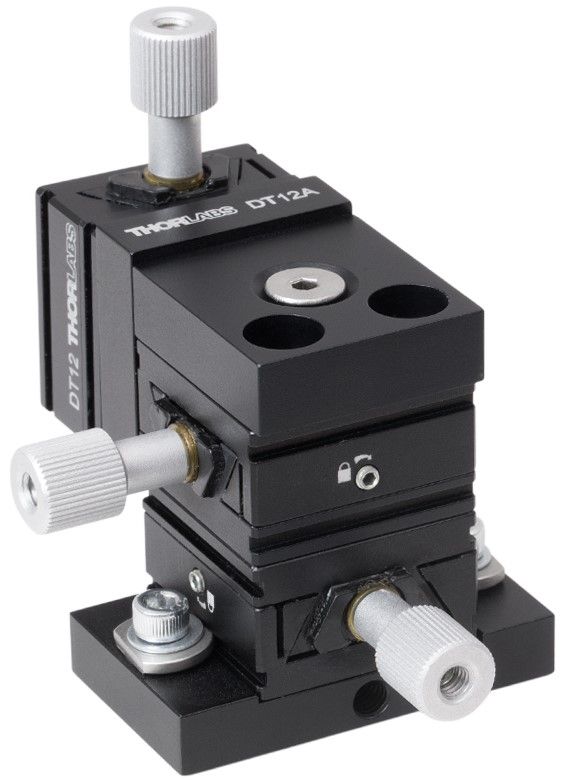 DT12XYZ - Транслятор на основе конструкции "ласточкин хвост", сдвиг: 1/2" по осям XYZ, основание для крепления на оптический стол, резьбовые отверстия: 8-32.