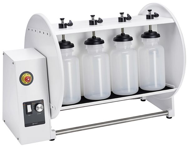 Модель Reax 20/4 с переворачивающимся типом движения подходят для работы с 4 бутылками одновременно. Аналоговый контроллер позволяет проводить встряхивание при скорости от 1 до 16 об/мин, что идеально подходит для пробоподготовки при анализе сточных вод.