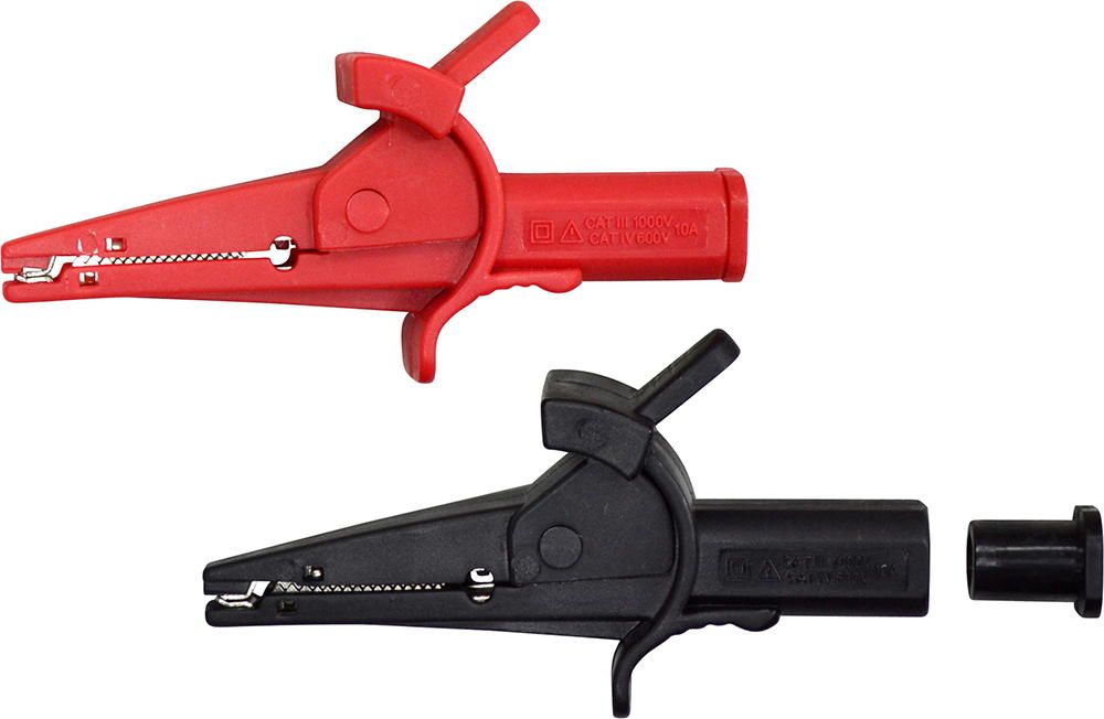 Комплект из двух зажимов (красный и черный): тип "крокодил"; длина 98 мм; макс. раскрыв 20 мм; 1000 В/10 А; 4 мм коннектор под щуп типа TEL-AL28-3 (-4); съемный ограничитель-заглушка.