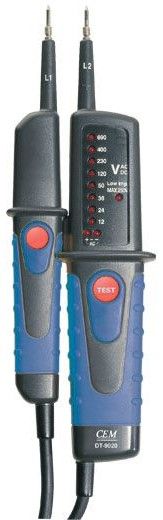 Указатель CEM DT-9020 представляет собой прибор в виде двух щупов, в один из которых встроен компактный блок управления. Такая комбинация позволяет использовать прибор для контроля параметров в труднодоступных местах. Индикация напряжения производится с помощью ряда светодиодов, каждый из которых реагирует на свой уровень напряжения (12, 24, 36, 50, 120, 230, 400, 690В). Индикатор CEM DT-9020 не требует управления оператора, действуя полностью автоматически: в процессе работы нет необходимости ручного выбора режима и диапазона.