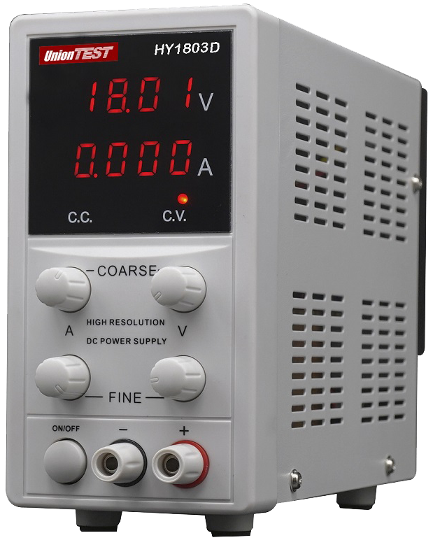 UnionTest HY1803D – источник питания, позволяющий получать регулируемое, точное и стабильное постоянное напряжение или постоянный ток. Две пары регуляторов грубой и точной настройки облегчают установку напряжения и тока, а цифровые индикаторы тока и напряжения упрощают считывание параметров выхода.