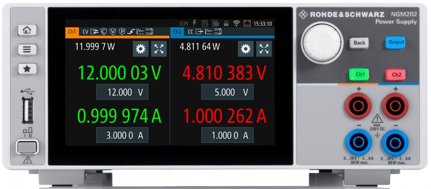 Двухканальный источник питания NGM202 обеспечивает до 60 Вт выходной мощности на канал. Выходные каналы не заземлены, гальванически изолированы и защищены от перегрузки и коротких замыканий.