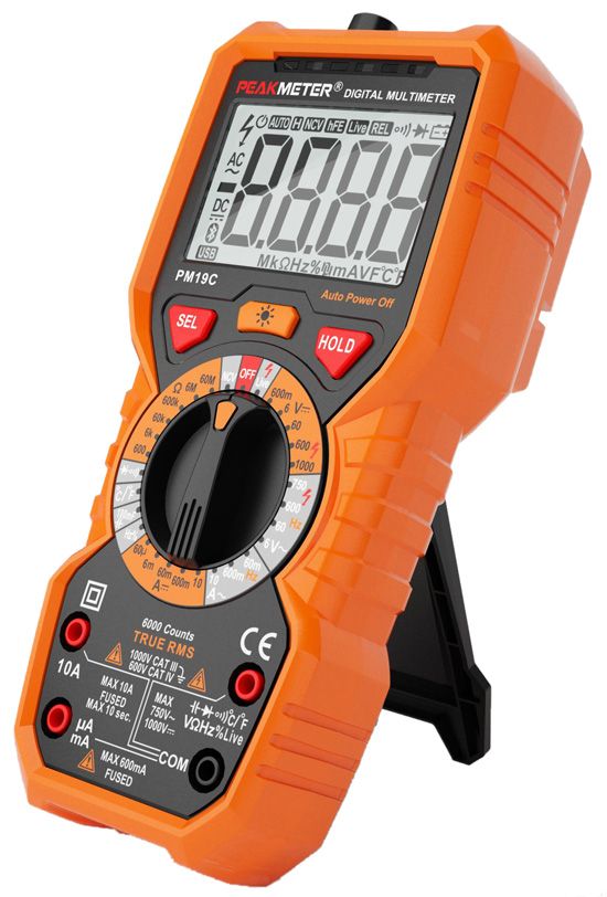 PeakMeter PM19C – это портативный многофункциональный цифровой мультиметр с функцией измерения среднеквадратического значения True RMS, оснащенный большим ЖК-дисплеем с задней подсветкой для удобства считывания показания, и фонарем.