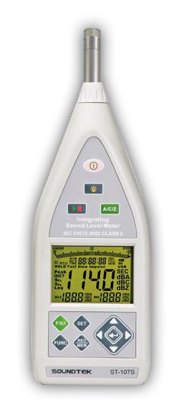 Профессиональный шумомер класс 2, измерение шума 30…130 дБ (частота 20 Гц…8 кГц), динамический диапазон 100 дБ; регистратор (37000 значений), аналоговый выход переменного напряжения, питание 4 х 1,5 В или от внешнего адаптера, 285 x 90 x 39 мм, 550 г.