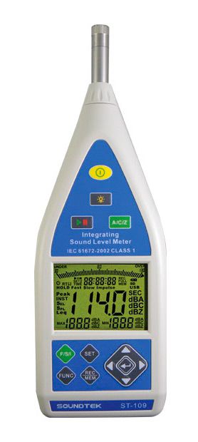 Профессиональный шумомер класс 1, измерение шума 30…130 дБ (частота 20 Гц…16 кГц), динамический диапазон 60 дБ; регистратор (37000 значений), аналоговый выход постоянного и переменного напряжения, питание 4 х 1,5 В или от внешнего адаптера, 285 x 90 x 39 мм, 500 г.