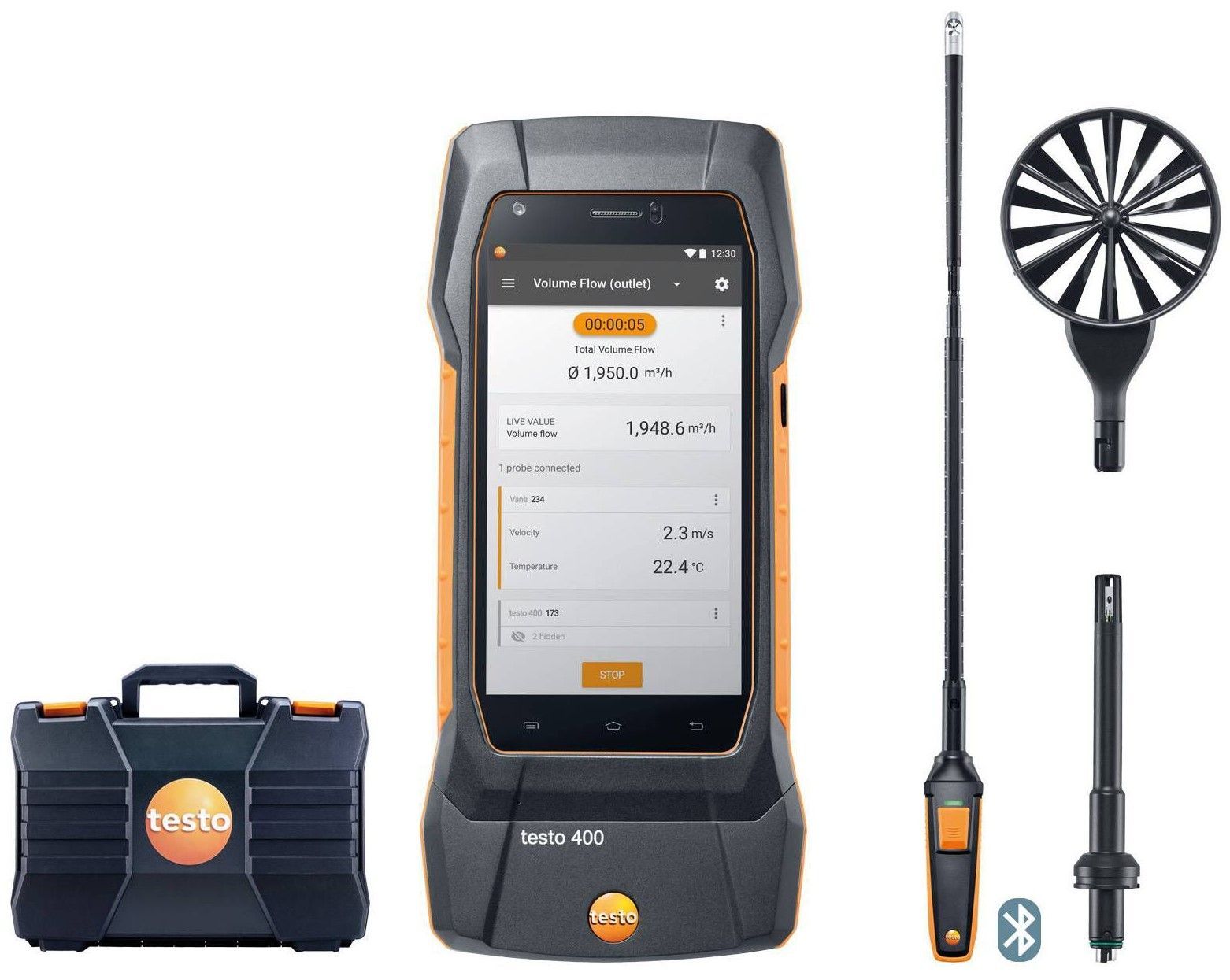 - В комплекте: универсальный измерительный прибор testo 400, зонд-крыльчатка диаметром 16 мм (с Bluetooth®-рукояткой и телескопической рукояткой), зонд-крыльчатка (Ø 100 мм), высокоточный зонд влажности/температуры, угловой переходник 90°, кейс