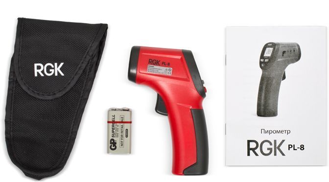 Бесконтактный пирометр RGK PL-8 имеет разрешение 8:1, встроенный лазерный указатель облегчает наведение на зону измерения температуры. Корпус прибора выполнен в форме пистолетной рукояти, а измерения производятся нажатием большой спусковой кнопки. Полученные данные отображаются на встроенном жидкокристаллическом дисплее прибора. Такая эргономика позволяет легко и удобно проводить измерения и снятие показаний. Выполняя замеры в неудобном положении, можно зафиксировать текущие температурные показатели на экране, используя функцию DATA HOLD.