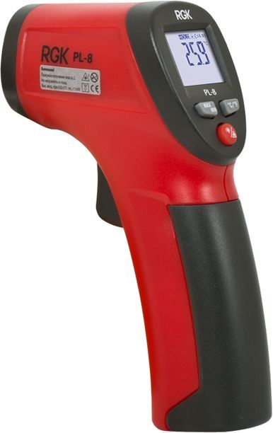 Бесконтактный пирометр RGK PL-8 имеет разрешение 8:1, встроенный лазерный указатель облегчает наведение на зону измерения температуры. Корпус прибора выполнен в форме пистолетной рукояти, а измерения производятся нажатием большой спусковой кнопки. Полученные данные отображаются на встроенном жидкокристаллическом дисплее прибора. Такая эргономика позволяет легко и удобно проводить измерения и снятие показаний. Выполняя замеры в неудобном положении, можно зафиксировать текущие температурные показатели на экране, используя функцию DATA HOLD.