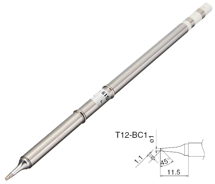 Конструкция этого сменного жала T12-BC1 представляет собой моноблок, включающий в свой корпус керамический нагреватель, температурный датчик и паяльную головку.