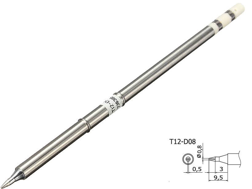 Конструкция этого сменного жала T12-D08 представляет собой моноблок, включающий в свой корпус керамический нагреватель, температурный датчик и паяльную головку.