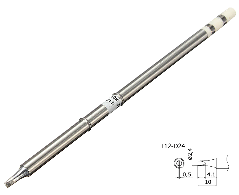 Конструкция этого сменного жала T12-D24 представляет собой моноблок, включающий в свой корпус керамический нагреватель, температурный датчик и паяльную головку.