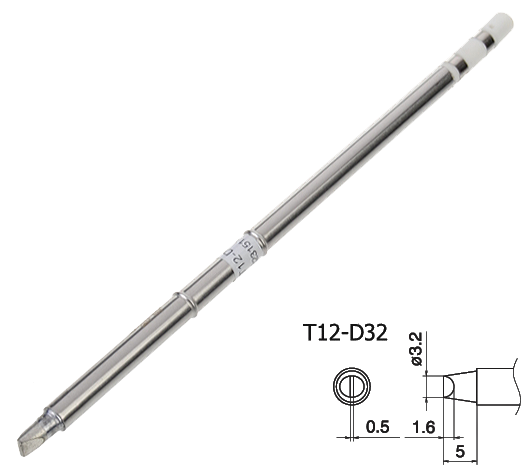 Конструкция этого сменного жала T12-D32 представляет собой моноблок, включающий в свой корпус керамический нагреватель, температурный датчик и паяльную головку.