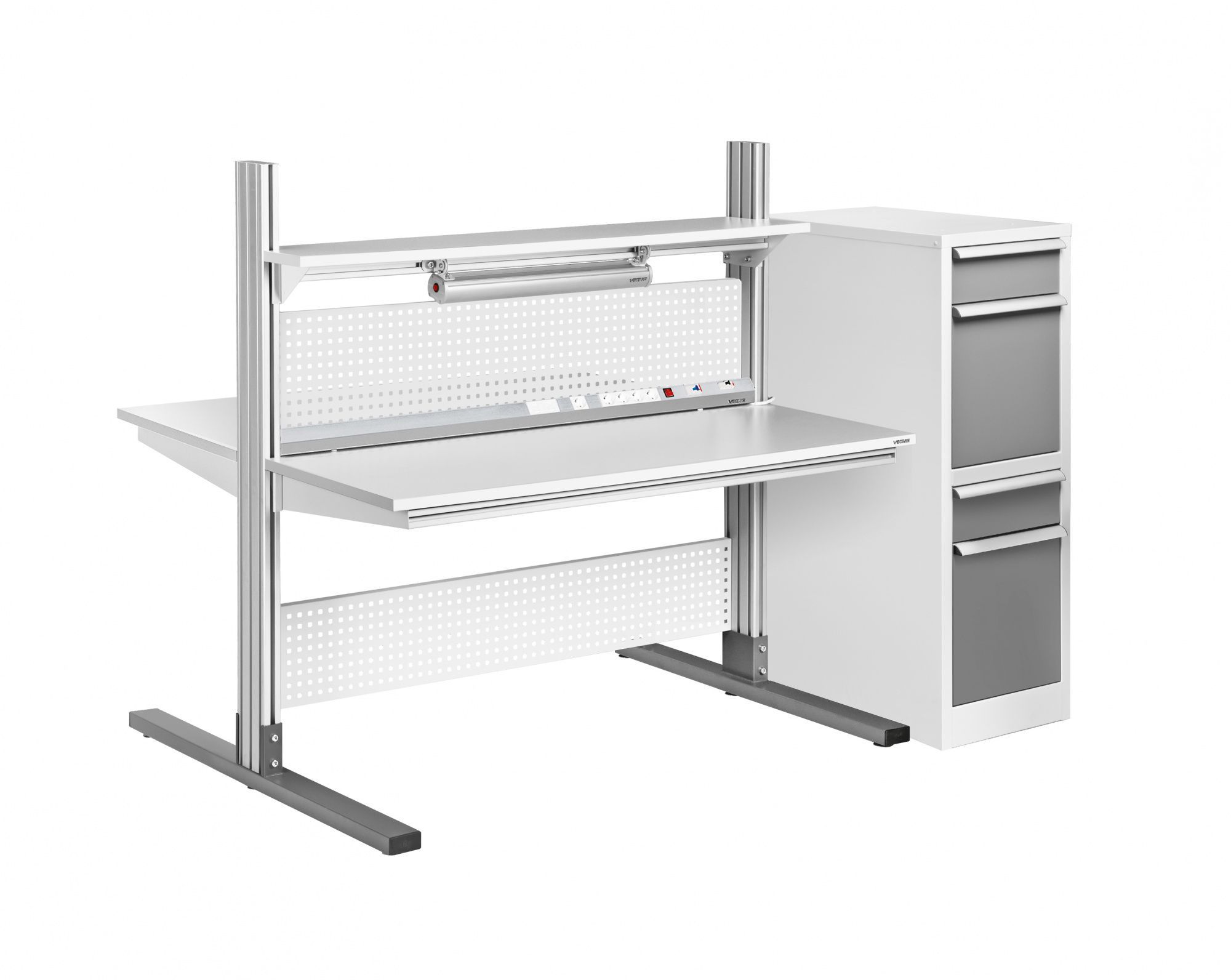 Вместительная металлическая приставная тумба предназначена для размещения документов, папок и любых дополнительных материалов. В тумбе 2 стандартных выдвигающихся ящика и 2 вместительные полки, все выдвигаются с помощью направляющих на 650 мм. Каждая из полок оборудована перфорированными боковыми экранами, которые могут быть установлены с любой стороны.