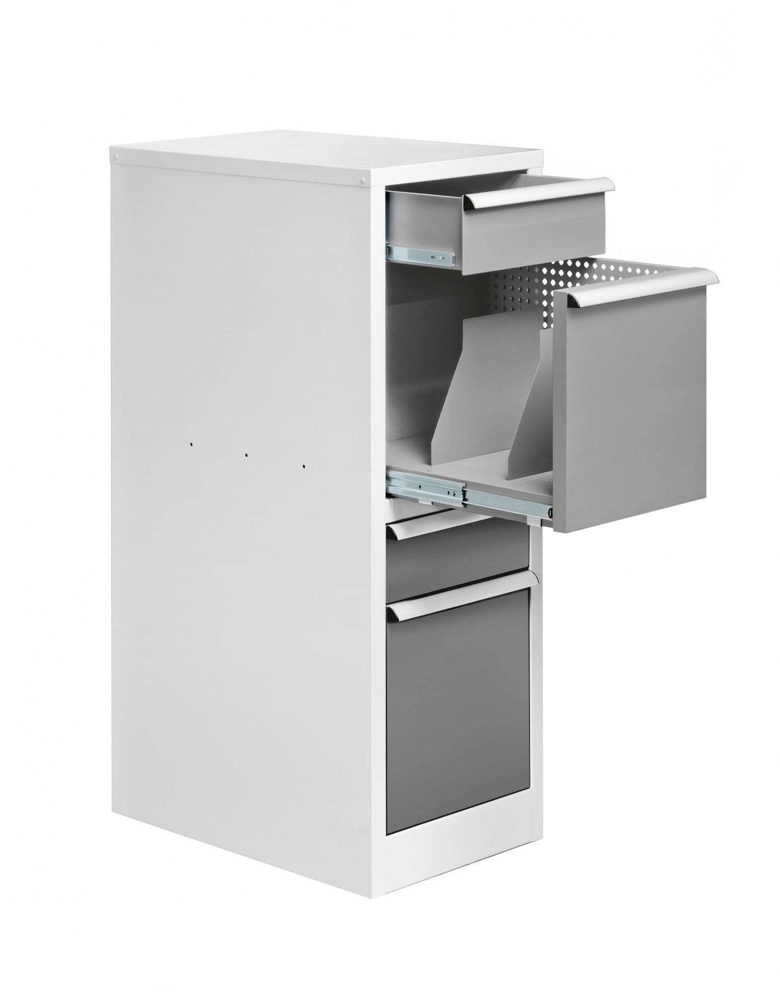 Вместительная металлическая приставная тумба предназначена для размещения документов, папок и любых дополнительных материалов. В тумбе 2 стандартных выдвигающихся ящика и 2 вместительные полки, все выдвигаются с помощью направляющих на 650 мм. Каждая из полок оборудована перфорированными боковыми экранами, которые могут быть установлены с любой стороны.