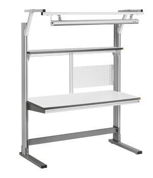 Благодаря легкости передвижения столешницы, полки и освещения по боковым направляющим алюминиевой рамы обеспечивается возможность установки рабочих поверхностей на требуемой высоте и непревзойденный комфорт при работе, в том числе и в положении стоя. При возникновении необходимости изменить высоту рабочей поверхности, пользователь может легко самостоятельно переместить столешницу, пофлку и освещение.