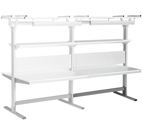 Комплект поставки: 2 зеркально расположенных стола с 1 боковой стойкой, двойная перфорированная панель, двойная нижняя планка, двойная полка для оборудования и 2 светильника.
