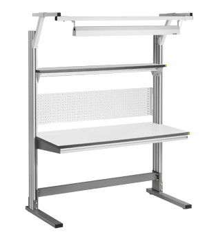 Благодаря легкости передвижения столешницы, полки и освещения по боковым направляющим алюминиевой рамы обеспечивается возможность установки рабочих поверхностей на требуемой высоте и непревзойденный комфорт при работе, в том числе и в положении стоя. При возникновении необходимости изменить высоту рабочей поверхности, пользователь может легко самостоятельно переместить столешницу, пофлку и освещение.