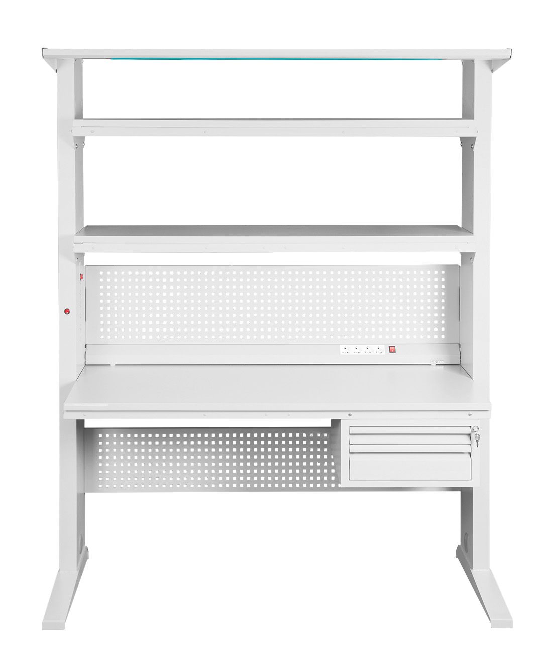Стол рабочий поставляется в комплекте: стол рабочий с боковыми стойками, основная полка, верхнее освещение, верхняя и нижняя перфопанели и боковой энергоблок. Быстросъемные боковые панели обеспечивают удобство доступа к внутренним коммуникациям.Возможна поставка в 2 модификациях – с правым (ПР в артикуле) или левым (Л в артикуле) энергоболоком в боковой панели. Встроенный энергоблок имеет 6 розеток и кнопку выключения.