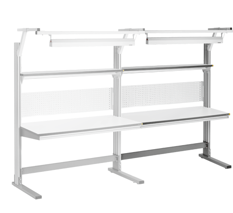 Благодаря легкости передвижения столешницы, полки и освещения по боковым направляющим алюминиевой рамы обеспечивается возможность установки рабочих поверхностей на требуемой высоте и непревзойденный комфорт при работе, в том числе и в положении стоя. При возникновении необходимости изменить высоту рабочей поверхности, пользователь может легко самостоятельно переместить столешницу, пофлку и освещение.