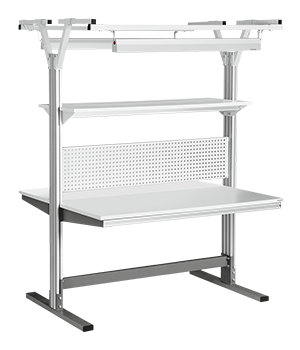 Благодаря легкости передвижения столешницы, полки и освещения по боковым направляющим алюминиевой рамы обеспечивается возможность установки рабочих поверхностей на требуемой высоте и непревзойденный комфорт при работе, в том числе и в положении стоя. При возникновении необходимости изменить высоту рабочей поверхности, пользователь может легко самостоятельно переместить столешницу, пофлку и освещение.