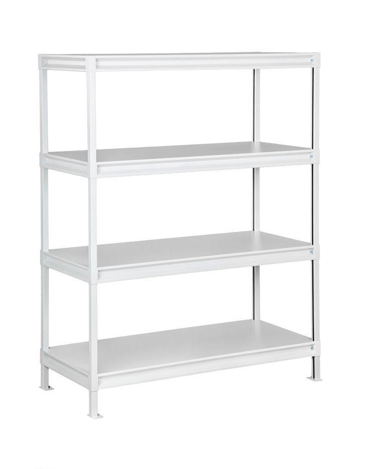 Стеллаж металлический усиленный с плавно регулируемыми по высоте полками. Не требует дополнительного выравнивания полов для установки. В стандартной комплектации стеллаж имеет 4 полки.