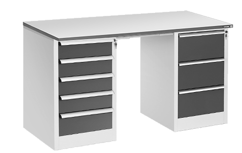 Столы с обычной «ногой» и планшетным драйвером с пятью ящиками имеют маркировку «+ДР-05» (например, СР-15-7+ДР-05 Констант).
