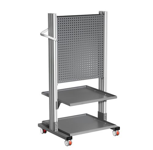 Стойка по умолчанию двуцветна и доступна для заказа только в общепромышленном исполнении. Подкатная стойка с перфорированной стенкой и удобной боковой ручкой для инструмента и оборудования. Перфорированная стенка позволяет крепить любые стандартные держатели для инструмента и комплектующих (К-01 - К-10). Стойка оборудована 4 колесиками, все со стопорным механизмом.