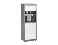 Металлический шкаф для документов, оснащенный двумя закрывающимися секциями, в каждой секции по 2 полки. Обе секции оснащены жалюзийными створками. Максимальная нагрузка на каждую полку 50 кг.