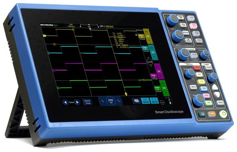 Осциллограф планшетного типа. Полоса пропускания 100 МГц. 4 аналоговых канала. Максимальная дискретизация 1 Гвыб/с. Максимальная длина записи 28 М точек. Скорость захвата осциллограмм 80000 осц/с. Вертикальное разрешение 8 бит. Коэффициент отклонения 500 мкВ/дел - 5 В/дел. Горизонтальная развертка 2 нс - 1000 с/дел. Курсорные измерения. 31 тип автоизмерений. 8 стандартных типов запуска + 7 типов последовательных шин (UART, I²C, SPI, CAN, LIN, MIL-1553B, ARINC429). Декодирование протоколов RS232/UART, I²C, SPI, LIN, CAN; опция - MIL-1553B, ARINC429. 6-разрядный частотомер. Интерфейсы USB 2.0, microUSB 2.0, LAN, microHDMI. Цветной сенсорный 8" мультач дисплей (800х600). Питание: сетевой адаптер 220 В / Li-ion батарея 7500 мА•ч / 7.4 В. Размеры 280x180x50 мм. Вес 1,43 кг.