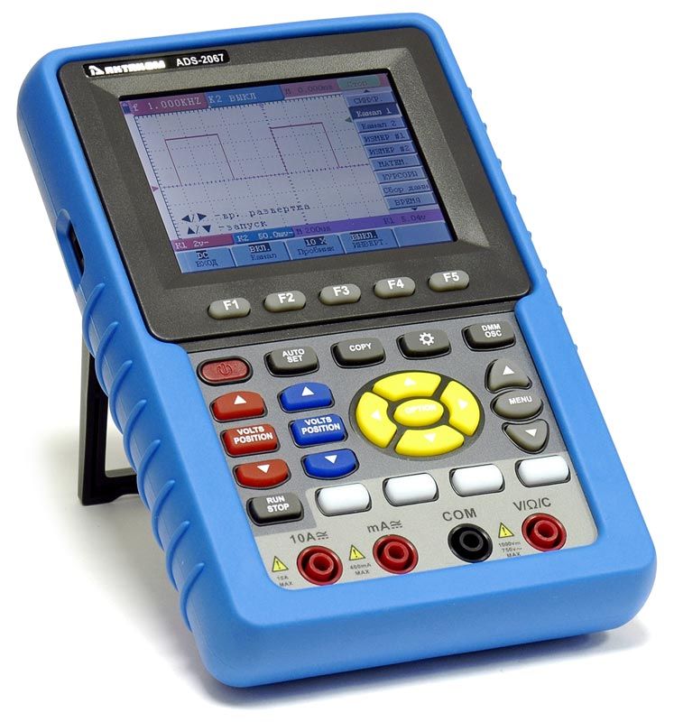 Осциллограф - мультиметр, полоса 60 МГц, 2 канала, цветной ЖКИ, дискретизация 1 Гвыб/сек, длина записи 6 кБ/канал, вертикальное разрешение 8 бит, развертка по вертикали 5 мВ...5 В/дел., по горизонтали 5 нс...100 с/дел., 20 автоизмерений, курсорные измерения, видео синхронизация с выбором строки, максимальное входное напряжение 400 Впик, встроенный мультиметр, USB интерфейс, аккумуляторное питание, размеры 180x115x40 мм, масса 645 г.