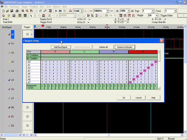 Анализатор работает с частотой до 200 МГц и позволяет выполнять проверку бинарных состояний по 32 каналам.
