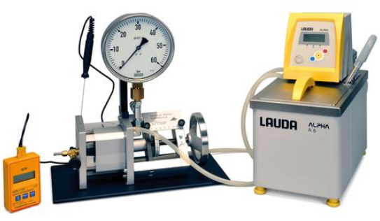 Высокоточный прибор для изучения сжатия и сжижения газа, определения критической точки и записи изотерм на p-V (Clapeyron) диаграммах. В качестве испытательного газа используется гексафторид серы (SF6), критическая температура которого составляет 318,6 К (45,5 ° C), а критическое давление - 3,76 МПа (37,6 бар), что позволяет легко провести эксперимент. Аппарат включает прозрачную измерительную ячейку, обладающую высокой устойчивостью к утечкам и сжатию. Объем внутри ячейки изменяется с помощью тонко регулируемого маховика, изменение отображается комбинацией фиксированной и поворотной шкалы с точностью до 1/1000 от максимального объема. Давление создается гидравлической системой, содержащей касторовое масло одобренного с медицинской точки зрения качества.