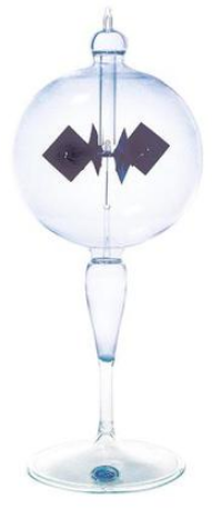 Устройство для демонстрации преобразования энергии излучения в кинетическую энергию. Поворотно-пластинчатое колесо установлено на металлическом наконечнике и снабжено четырьмя пластинами, каждая из которых окрашена в черный цвет с одной стороны; помещается в вакуумированную стеклянную колбу.
