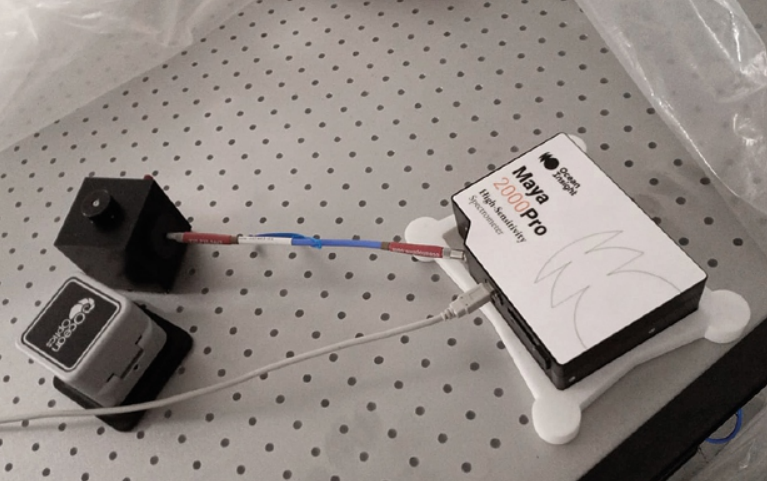 Стенд для измерения квантовой эмиссии фотолюминесценции (PLQE) на небольших образцах (порошках). Состоит из высокочувствительного спектрометра Ocean Isight серии Maya рабочего диапазона длин волн 200-1100 нм и спектральной чувствительностью 0,1 нм, интегрирующей сферы Newpor и источников света. Позволяет измерять квантовую эмиссию люминесценции частиц даже такого малого размера, как крупицы порошков на головке иголки.Красноярск, 2023