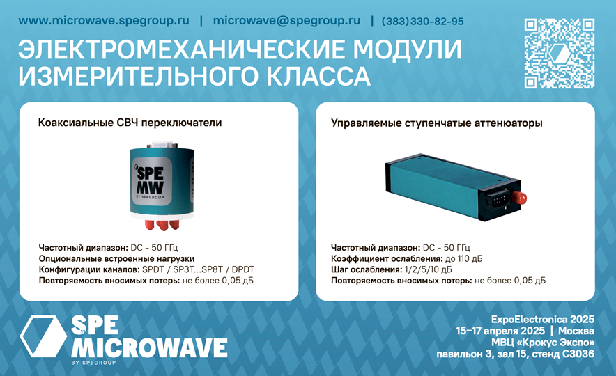 Хотите узнать больше? Приглашаем вас с 15 по 17 апреля на наш стенд С3063 (15 зал, 3 павильон) на международной выставке ExpoElectronica 2025 в Москве, где будут представлены демонстрационные экземпляры электромеханических модулей SPE Microwave и других СВЧ-компонентов.