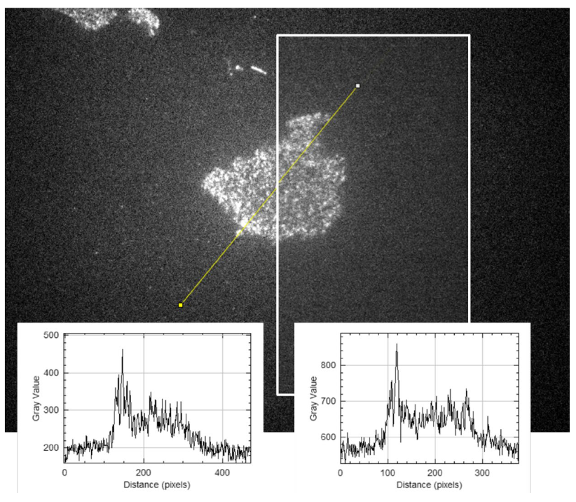 Рисунок 2: Сравнение Aries-16 и EMCCD (вставка). Изображение было одновременно получено на Aries-16 (внешнее изображение, пиксель 16 мкм) и EMCCD (вставка, пиксель 16 мкм), время экспозиции 30 мс, объектив с увеличением х100. Гистограммы, показывающие значения в оттенках серого через желтую линию, Aries (слева) и EMCCD (справа).