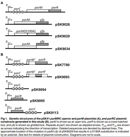 The 46 kb Staphylococcus aureus plasmid pSK41 harbors a genetic locus, parMRC (Fig 1A), that encodes an actin-like protein, ParM [6,7]. pSK41 is the prototype of a family of medically important conjugative staphylococcal multiresistance plasmids [8] that have most recently been implicated in the development of vanA-mediated vancomycin resistance in S. aureus [9]. We have previously shown that pSK41 parMRC significantly enhances the segregationa stability of an unstable staphylococcal mini-plasmid, and site directed mutagenesis indicated that the NTPase motif of ParM is required for this stability phenotype [6]. The parMRC locus also encodes a DNA binding protein, ParR, which recognizes a series of 10 bp direct repeats, parC, located directly upstream from the parM and parR structural genes. Crystallographic data of ParR bound parC DNA shows that ParR binds as a dimer-of-dimers to the parC repeats, producing an extended macromolecular structure known as the ‘segrosome’ [6]. In the related ParMRC partitioning system of the E. coli multiresistance plasmid R1, ParM interacts with the segrosome to segregate replicated plasmids in a bidirectional fashion. In vitro data indicate that pSK41 ParM adopts a polymeric conformation which is very different to that of actin, MreB and R1 ParM [10]. Whereas pSK41 ParM forms a helical single stranded filament, both R1 ParM and actin adopt a two-start helical conformation, while MreB forms linear protofilaments [10]. Remarkably, database searching using pSK41 ParM crystal structure co-ordinates revealed that this protein is most structurally related to the chromosomally encoded Alp Ta0583 from the archaea Thermoplasma acidophilum, and not the R1 plasmid partitioning protein ParM, underscoring the structural diversity within microbial Alps. Biophysical analyses have suggested that pSK41 ParM filaments undergo a treadmilling-like mechanism of motion in vitro similar to that of F-actin [10]; contrastingly, R1 ParM exhibits a form of dynamic instability similar to that of eukaryotic tubulin [11]. In vivo studies in the native staphylococcal host, using a ParM C-terminal fusion to red fluorescent protein (ParM-RFP), also suggested that pSK41 ParM filaments are not dynamically unstable [12], in agreement with the in vitro observations [10]. Interestingly, the plasmid-partitioning Alp protein Alp7A, from the 55 kb Bacillus subtilis plasmid pLS20, exhibits both treadmilling and dynamic instability [3]. These observations highlight significant diversity in the dynamic properties exhibited by Alps.